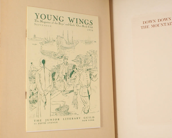 Down Down the Mountain was the monthly selection of the Junior Literary Guild in September, 1934. Eleanor Roosevelt served on the board of the Junior Literary Guild at the time and was a huge advocate for children's literature. This book includes the monthly Young Wings Magazine: The Magazine of the Boys' and Girls' Own Book Club, September 1934. The Magazine is adhered to the inside front page. (See our photographs.)
