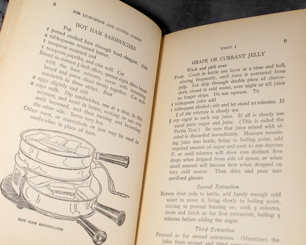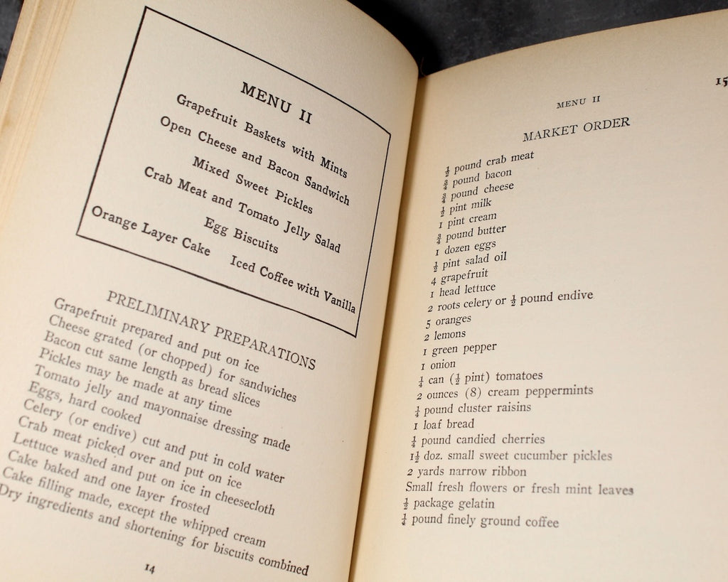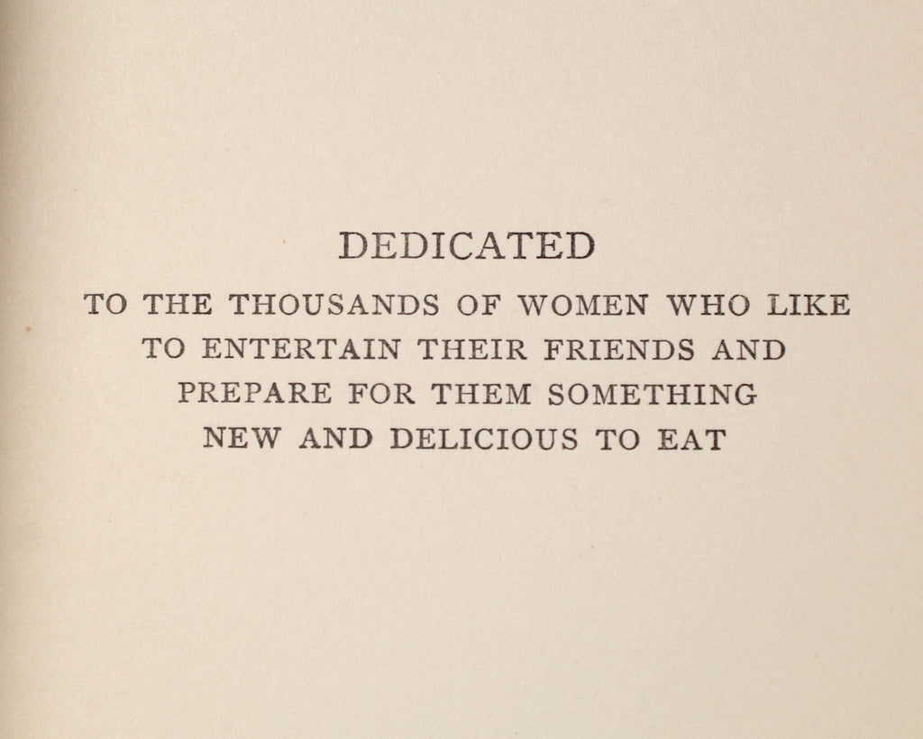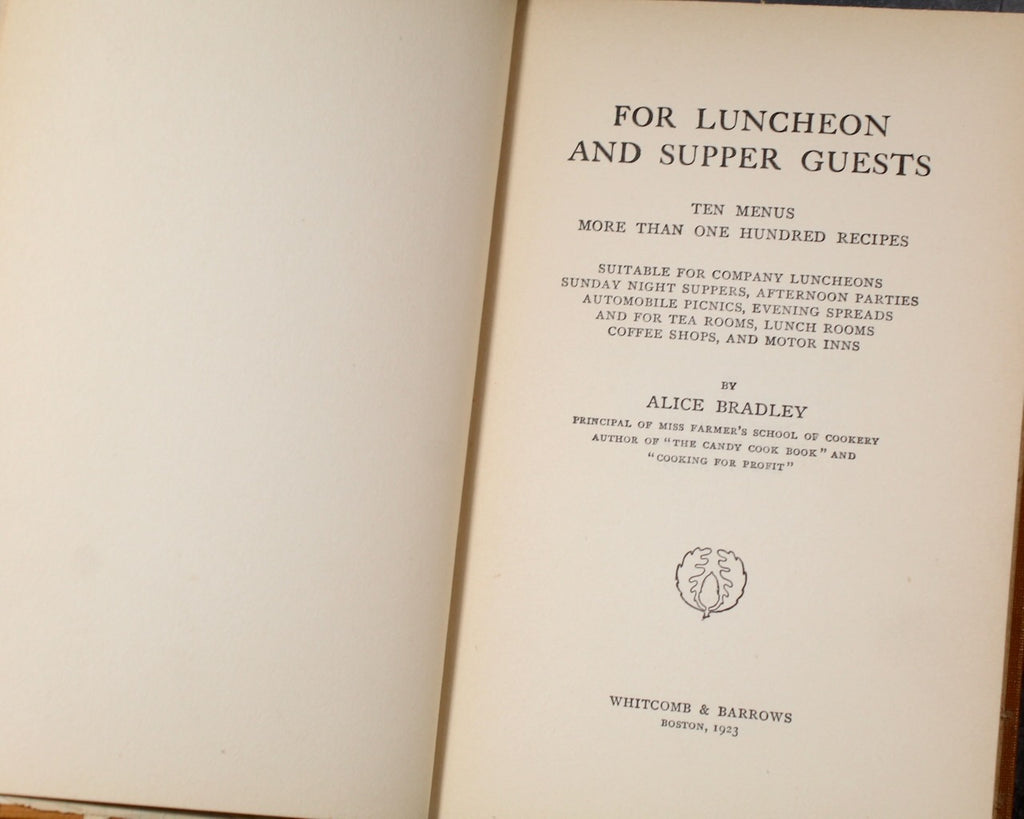 For Luncheon & Supper Guests was written in 1922 by Alice Bradley, Principal of the Miss Farmer Cooking School. The book features "10 menus and more than 100 recipes suitable for company luncheons, Sunday night suppers, afternoon parties, automobile picnics, evening spreads, and for tea rooms, lunch rooms, coffee shops, and motor inns.