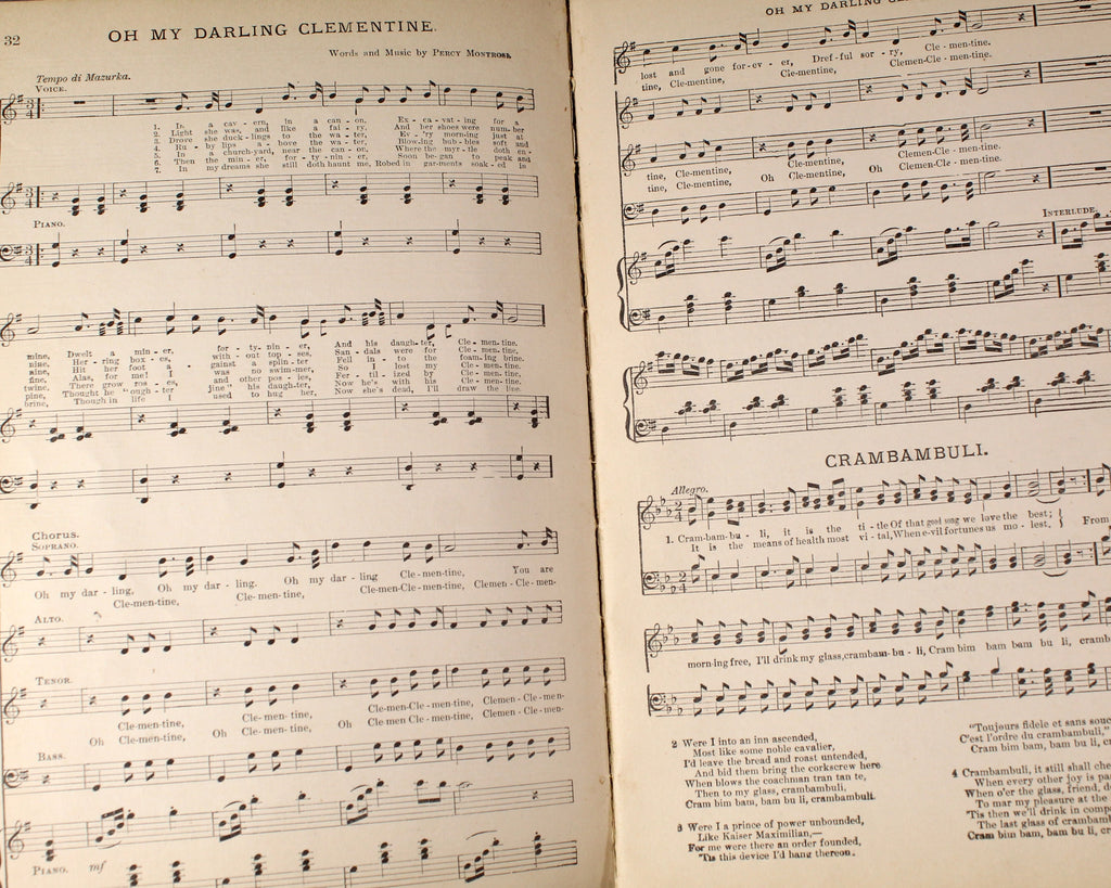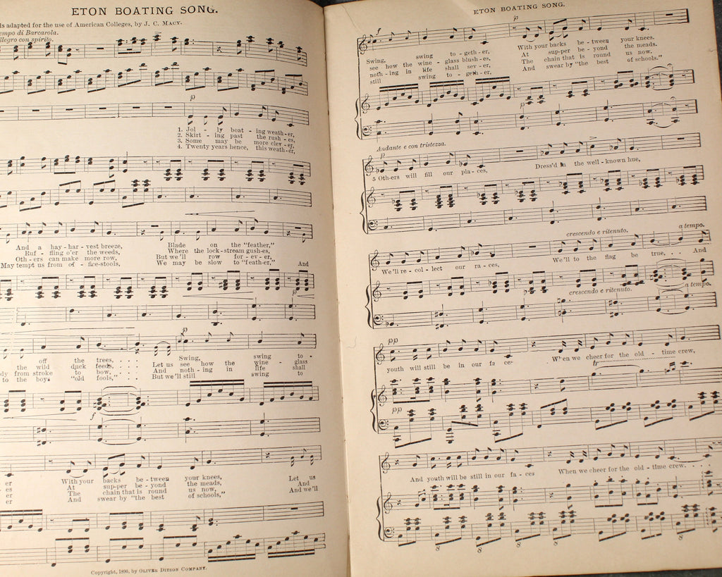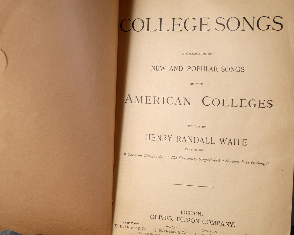 College Songs was originally published in 1800. This is a copy from the 61st edition published in 1887! Imagine that. It was so popular in its day, 61 editions were published and more than 350,000 copies sold! 104 pages of music and lyrics, it features songs such as The Dude Who Couldn't Dance, Eton Boating Song, McSorley's Twins, and There's Music in the Air.