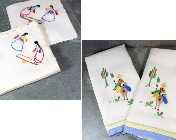 Vintage linens have a quality and feel that you just can't find anymore. In this set, we've put together 2 matching hankies and 2 linen napkins. The handkerchiefs feature two young ladies playing on a seesaw and are 8 1/2" square. The napkins feature a donkey and rider with cacti around and measure 12 1/2" x 19". These are the perfect gift anyone who loves beautiful linens.