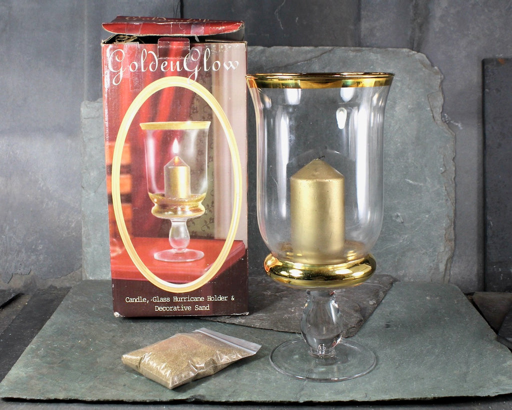 This Golden Glow hurricane glass candleholder from the 1970s makes a lovely centerpiece statement for holidays. A beautifully shaped glass trimmed in gold fits a golden pillar candle. And the set includes decorative sand to secure the candle in place. Comes with the original box for easy storage too.