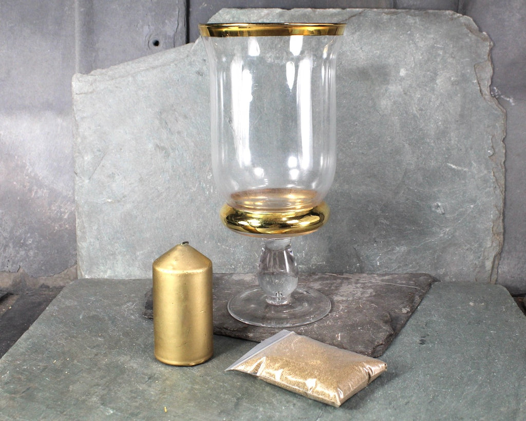 • Golden Glow Hurricane Glass Candleholder with gold pillar candle and sand