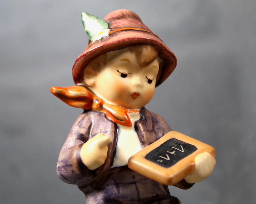 This is a classic Hummel figurine in design. "One Plus One" #556, features a young boy with chalkboard. This is rendered in Hummel's classic, highly detailed and expressive design.